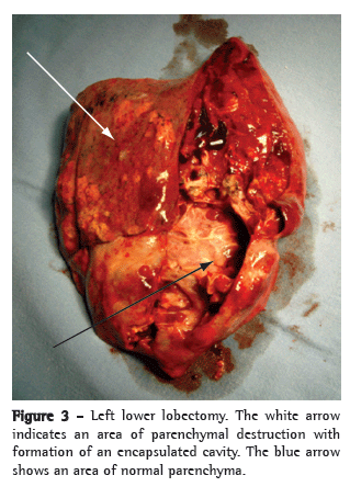 Physical examination revealed good general health, no fever, an HR of 88 bpm and an arterial pressure of 90-145 mmHg. The cardiac auscultation was normal, and examination of the lung revealed reduced expansion and diminished breath sounds in the lower third of the left hemithorax, as well as dullness to percussion in this same region. The rest of the physical examination revealed no abnormalities. The results of the laboratory tests performed at admission, such as blood workup, lipid profile, coagulation profile, determination of electrolyte concentrations, renal function test and hepatic function test, were normal. The ESR was 32 mm/h. Serology for HIV was negative. A chest X-ray at admission revealed opacity in the posterior segment of the left lower lobe (Figure 1). A CT scan of the chest with two-dimensional reconstruction revealed an aortic branch directed toward the pulmonary opacity (Figure 2), which is consistent with a diagnosis of pulmonary sequestration. The patient was referred for surgery, and a left lower lobectomy was performed to resect the anomalous pulmonary tissue (Figure 3). After the macroscopic analysis of the surgical sample, the patient was diagnosed with intralobar sequestration. The postoperative evolution was favorable, and the patient was discharged to outpatient treatment.