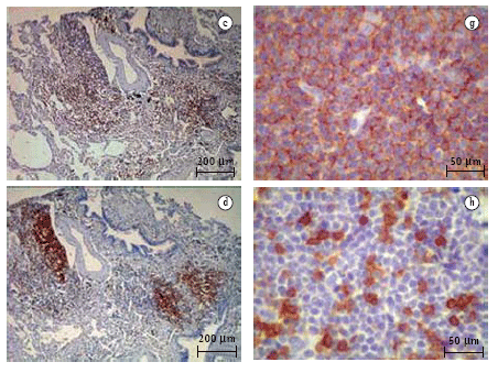 Figure 1 shows the lymphocytic infiltrates in different histological patterns of lymphoproliferative pulmonary disorders seen after H&E and immunohistochemical staining. In the cases of LIP (Figures 1a to 1d), there was marked lymphocytic infiltration with extensive involvement of the alveolar septa (Figures 1a and 1b). The lymphocytic infiltrate consisted mostly of lymphocytes (B and T cells) with varying numbers of plasma cells. The T lymphocytes (CD3 cells) were seen predominantly in the alveolar septal interstitium (Figure 1c), whereas B lymphocytes (CD20 cells) were primarily found in aggregates within lymphoid follicles and focally in thickening alveolar walls (Figure 1d). In contrast, the cases of low-grade lymphoma (Figures 1e to 1h) presented diffuse, dense, and monomorphous infiltration of small lymphoid cells with irregular nuclear contours (Figures 1e and 1f) remodeling the lung architecture. The neoplastic cells were CD20-positive monoclonal B cells (Figure 1g), with a background population of variable reactive CD3-positive T-cells (Figure 1h).