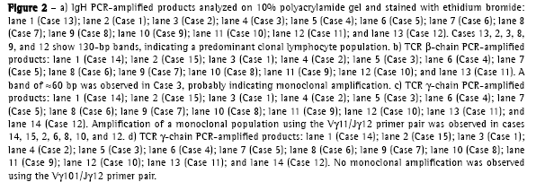 The PCR analysis of the IgH gene rearrangement using the VH/JH primer pair revealed a band of 130 bp (predicted size range, 100-150 bp) indicating the presence of a predominant clonal lymphocyte population in high-grade T lymphoma (Case 13); LIP (Cases 2, 8, and 9); pseudolymphoma (Case 3); lymphomatoid granulomatosis (Case 6); and Hodgkin's disease (Case 12). The cases exhibiting more than one evident band were considered polyclonal, whereas bands lower than 75 bp were assumed to be nonspecific (Figure 2a).