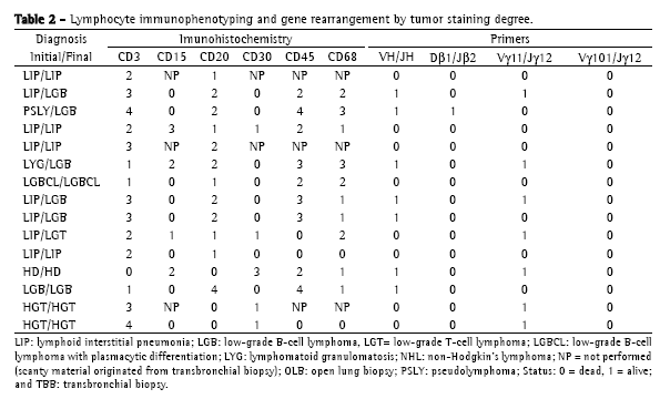 Regardless of the lymphocytic/lymphoproliferative pathogenetic mechanism, detection of monoclonal B and T cells by immunophenotyping and PCR had an impact on the diagnosis of pulmonary lymphomas in patients previously diagnosed with LIP. Therefore, immunophenotyping and PCR should be used as the 'gold standard' techniques in routine practice. Interpretable PCR results were obtained in the majority of the cases analyzed, demonstrating that our PCR analysis could become a routine procedure. The detection of gene rearrangement in lung biopsies, especially in cases diagnosed as LIP, is very important for the establishment of an accurate diagnosis of lymphoma. In order to determine whether or not these cases represent malignant transformation from LIP, randomized, prospective trials involving large patient samples are needed. In addition, we believe that further studies of lymphoid/lymphoproliferative disorders are warranted in order to validate the results of our immunophenotyping and gene rearrangement analysis.