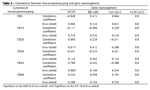 Table 1 depicts clinical data. The median age of the patients was 40 years (range, 2-81 years). There were 10 females and 5 males. Patients younger than 40 years presented greater CD15 expression in lymphomas (p = 0.04). All male patients presented VY11 expression, whereas 8 of the 10 female patients did not express VY11 (p = 0.007). No differences were detected in terms of immunophenotyping, gene rearrangement, gender, or age.