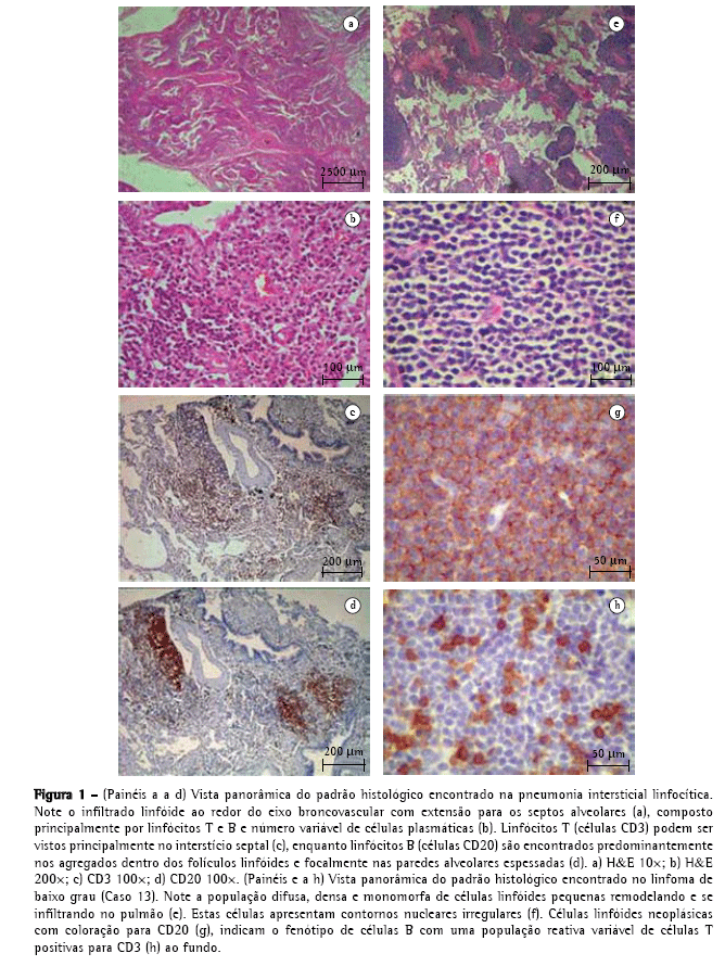 Resultados A Figura 1 mostra os infiltrados linfocíticos em diferentes padrões histológicos de transtornos pulmonares linfoproliferativos vistos após a coloração com H&E e a coloração imunohistoquímica. Nos casos de PIL (Figuras 1a a 1d) houve acentuada infiltração linfocítica com extenso envolvimento dos septos alveolares (Figuras 1a e 1b). Os infiltrados linfocíticos eram formados principalmente por linfócitos (células B e T) com números variados de células plasmáticas. Os linfócitos T (células CD3) foram vistos predominantemente no interstício do septo alveolar (Figura 1c), enquanto os linfócitos B (células CD20) foram encontrados principalmente nos agregados dentro dos folículos linfóides e focalmente nas paredes alveolares espessadas (Figura 1d). Já os casos de linfoma de baixo grau (Figuras 1e a 1h) apresentaram infiltração difusa, densa e monomorfa das células linfóides pequenas com contornos nucleares irregulares (Figuras 1e e 1f) remodelando a arquitetura pulmonar. As células neoplásicas eram células B monoclonais positivas para CD20 (Figura 1g), com uma população reativa variável de células T positivas para CD30 ao fundo (Figura 1h).