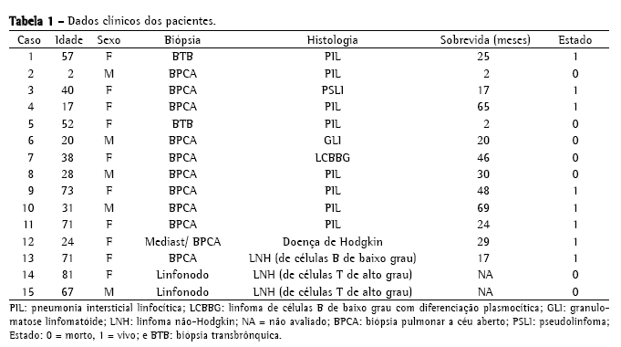 Métodos Este estudo foi aprovado pelo Comitê de Ética da Universidade de São Paulo. Blocos de parafina com quantidades suficientes de tecido foram coletados de nossos arquivos para a realização de cortes seriados para as preparações histoquímicas. Todas as biópsias haviam sido obtidas durante o atendimento clínico de rotina dos pacientes. A população do estudo foi composta por 9 casos (6 pacientes do sexo feminino e 3 do sexo masculino; mediana de idade de 41 anos). As amostras foram avaliadas por patologistas pulmonares experientes que verificaram que 8 dos casos apresentavam um padrão histológico compatível com PIL e que o caso restante apresentava um padrão histológico compatível com pseudolinfoma (Tabela 1). O diagnóstico foi baseado em achados clínicos e histológicos em biópsias (7 biópsias pulmonares cirúrgicas e 2 biópsias transbrônquicas) obtidas entre 1982 e 2002 e reclassificadas, de forma unânime, de acordo com a American Thoracic Society/European Respiratory Society International Multidisciplinary Consensus Classification of Idiopathic Interstitial Pneumonias. (24) Os casos de PIL secundária à síndrome de Sjögren ou à síndrome da imunodeficiência adquirida foram excluídos do estudo.