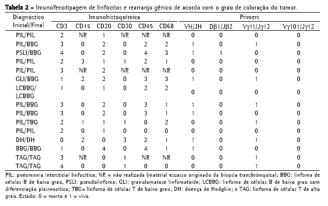 Resultados: Todos os 8 casos de PIL expressaram imunocoloração moderada a forte para CD3, em contraste com apenas 2 casos de linfoma e 1 caso de pseudolinfoma. Rearranjo gênico foi detectado em 4 de 8 casos de PIL, o que mudou o diagnóstico de PIL para linfoma, indicando, assim, a importância da detecção de rearranjo gênico em casos de PIL. Nesta situação, rearranjo gênico usando-se os pares de primers VH/JH e Vγ11/Jγ12 foi detectado em 3 e 1 casos de PIL, respectivamente, e não foram detectadas anormalidades gênicas usando-se as pares Dβ1/Jβ2 e Vγ101/Jγ12. Uma associação positiva foi detectada entre a intensidade de imunoexpressão CD20 e CD68 e rearranjo gênico usando-se o par de primers VH/JH. Antes do rearranjo gênico, 4 pacientes com PIL morreram rapidamente, enquanto que, após o rearranjo gênico, apenas 1 paciente com PIL morreu. Conclusões: A detecção de células B e T monoclonais por imunofenotipagem e reação em cadeia da polimerase mostrou impacto no diagnóstico de linfomas pulmonares em pacientes previamente diagnosticados com PIL. Portanto, imunofenotipagem e reação em cadeia da polimerase devem ser incluídas como métodos de 'padrão ouro' na rotina diagnósticObjetivo: Determinar a utilidade, na prática rotineira, da análise da clonalidade dos linfócitos T e B nos tecidos pulmonares por reação em cadeia da polimerase no diagnóstico das doenças linfoproliferativas pulmonares. Métodos: Avaliaram-se, mediante análise imunohistoquímica e rearranjo molecular dos genes, 8 casos de pneumonia intersticial linfocítica (PIL) e 7 casos de doenças linfoproliferativas pulmonares. Resultados: Todos os 8 casos de PIL expressaram imunocoloração moderada a forte para CD3, em contraste com apenas 2 casos de linfoma e 1 caso de pseudolinfoma. Rearranjo gênico foi detectado em 4 de 8 casos de PIL, o que mudou o diagnóstico de PIL para linfoma, indicando, assim, a importância da detecção de rearranjo gênico em casos de PIL. Nesta situação, rearranjo gênico usando-se os pares de primers VH/JH e Vγ11/Jγ12 foi detectado em 3 e 1 casos de PIL, respectivamente, e não foram detectadas anormalidades gênicas usando-se as pares Dβ1/Jβ2 e Vγ101/Jγ12. Uma associação positiva foi detectada entre a intensidade de imunoexpressão CD20 e CD68 e rearranjo gênico usando-se o par de primers VH/JH. Antes do rearranjo gênico, 4 pacientes com PIL morreram rapidamente, enquanto que, após o rearranjo gênico, apenas 1 paciente com PIL morreu. Conclusões: A detecção de células B e T monoclonais por imunofenotipagem e reação em cadeia da polimerase mostrou impacto no diagnóstico de linfomas pulmonares em pacientes previamente diagnosticados com PIL. Portanto, imunofenotipagem e reação em cadeia da polimerase devem ser incluídas como métodos de 'padrão ouro' na rotina diagnóstica.