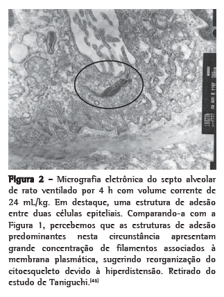 Um exemplo de reorganização do citoesqueleto é demonstrado nas Figuras 1 e 2, nas quais as estruturas de adesão entre as células epiteliais alveolares de ratos ventilados com VC baixo (Figura 1) e alto (Figura 2) são evidenciadas por microscopia eletrônica.(45)