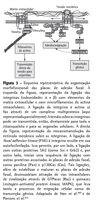 As integrinas são as proteínas da membrana celular responsáveis pela interação da matriz extracelular ao citoesqueleto. As forças presentes no interstício pulmonar são transmitidas às células através da tensão sobre as integrinas, que as repassam para o citoesqueleto. A análise ultraestrutural mostrou a existência de "placas de adesão focal", que são regiões especializadas da membrana celular ricas em integrinas e em elementos do citoesqueleto, onde se dá a interação bidirecional entre a célula e a matriz.(44) Nessas placas de adesão, os feixes de microfilamentos de actina do citoesqueleto se ancoram à face citoplasmática das integrinas através de um complexo multimolecular de proteínas juncionais. Alguns dos constituintes participam da ligação estrutural das integrinas ao citoesqueleto de actina, enquanto outras são moléculas de sinalização.(46,47) Sendo assim, essas estruturas dinâmicas seriam responsáveis pela monitorização da tensão do meio externo sobre a célula, desempenhando um papel importante no comportamento celular.(46,47) Entretanto, os mecanismos pelos quais os sinais mecânicos, transmitidos às integrinas e ao citoesqueleto, são submetidos à transdução para um sinal bioquímico ainda não são bem compreendidos. Já se observou que as integrinas geram segundos mensageiros intracelulares nas junções de ancoragem pela sua associação com outras proteínas, como paxilina, talina e vinculina, e com algumas quinases, como focal adhesion kinase (FAK), PKA, PKC, mitogen-activated protein kinase (MAPK) e c-Src, além de outros complexos enzimáticos como Rho-GTPase e fosfolipase C.(48-50)