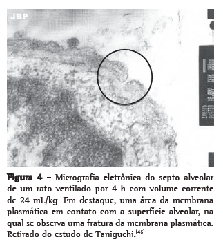 Os estudos subsequentes se concentraram nos fatores mecânicos desencadeantes dessa lesão, como pressão de pico respiratório e volume corrente (VC).(9-12) Dreyfuss et al. confirmaram os achados de Webb e Tierney e demonstraram que VC era o determinante mais importante no estresse lesivo ao alvéolo e à membrana alveolocapilar (o que originou o termo "volutrauma").(13,14) Em um estudo importante, eles compararam ratos ventilados com altos VC e pressão negativa (através de um ventilador de pressão negativa do tipo iron lung) com animais ventilados com altas pressões e baixos VC (com restrição toracoabdominal por enfaixamento). Somente houve edema extravascular pulmonar e aumento da permeabilidade microvascular nos animais com altos VC, concluindo-se que o aumento do VC foi o responsável pelo edema induzido por ventilação.(13) Cabe ressaltar que o modelo usado não permitia diferenciar os efeitos deletérios do VC dos relacionados ao aumento da pressão transpulmonar.