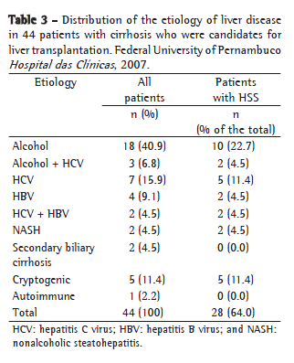 In summary, the frequency of HPS in the liver transplant candidates analyzed in the present study was high, even when different A-aDO2 cut-off points were used. In addition, we found no association between the occurrence of HPS and the variables analyzed. Studies involving larger numbers of patients with cirrhosis, HSS (without cirrhosis), and MLD could confirm these findings.