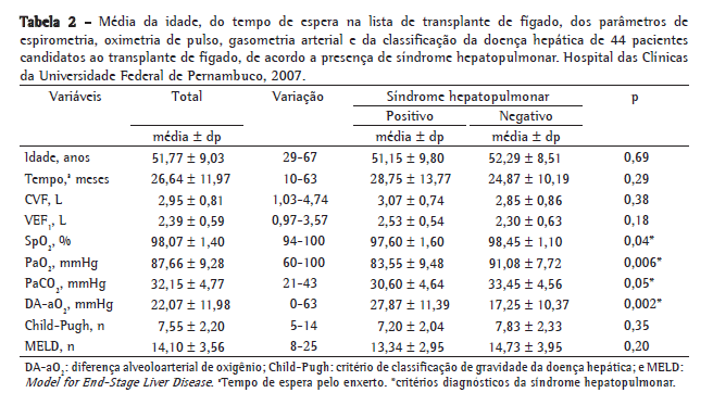 Na ocasião, foram obtidos 10 mL de sangue de veia periférica para a dosagem de albumina, aminotransferases, bilirrubina total, creatinina e international normalized ratio (INR, taxa normatizada internacional) do tempo de protrombina, para classificação MELD e Child-Pugh. Foram também obtidos 2 mL de sangue da artéria radial, utilizando técnicas de punção e de manipulação da amostra recomendadas pela Sociedade Brasileira de Pneumologia e Tisiologia, para a análise de pH, PaCO2, PaO2, e DA-aO2, utilizando-se um aparelho de gasometria modelo GEM 3000 (Instrumentation Laboratory, Bedford, MA, EUA).(16) O valor de DA-aO2 foi também calculado segundo uma equação normatizada,(1) considerando o paciente na posição sentada, respirando ar ambiente e ao nível do mar. Todos os exames foram realizados no Laboratório Central do HC-UFPE e se utilizaram os métodos da rotina.