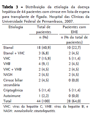 As frequências da etiologia de cirrose e da associação com EHE (DHM) estão demonstradas na Tabela 3.