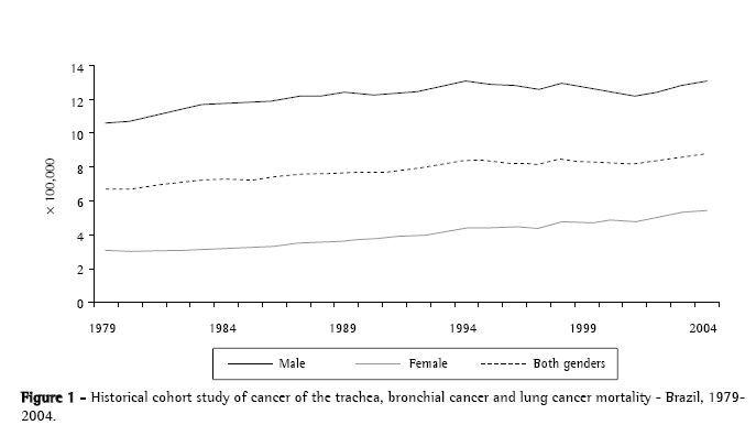According to some researchers,(8) the investigation into the historic tendency of health-related events, among which lung cancer mortality can be included, enables a more adequate analysis of health risk control measures, as well as allowing possible changes in their epidemiological structure to be detected. Therefore, the objective of this study was to analyze the temporal trends and geographic distribution of mortality from cancer of the trachea, bronchial cancer, and lung cancer in Brazil from 1979 to 2004.