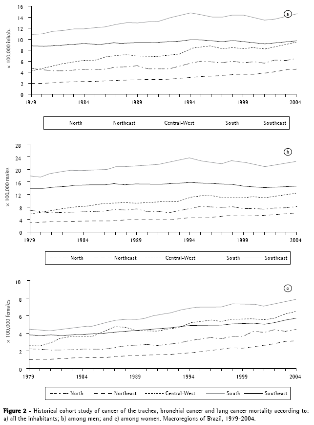 A historical cohort study of cancer of the trachea, bronchial cancer, and lung cancer mortality in Brazil from 1979 to 2004 was conducted. The number of deaths is taken from the Sistema de Informações sobre Mortalidade (SIM, Mortality Database)(3) created by the National Ministry of Health in 1975. The deaths included in the study were caused by malignant cancers of the trachea, bronchioles and lung classified according to the Ninth Revision of the International Classification of Diseases (ICD-9), under code 162 (between 1979 and 1995) and, according to the ICD-10, under the codes C33 and C34 (between 1996 and 2004). The deaths were classified according to the macroregion of residence (north, northeast, central-west , southeast, or south), gender (male or female) and age bracket (in 5-year brackets until 75 years or older) of the deceased. The decades investigated correspond to the total period for which SIM data on nationwide mortality are available.
