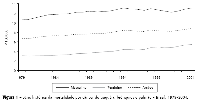 Resultados No período entre 1979 e 2004, foram registrados no Brasil 287.484 óbitos decorrentes de câncer de traquéia, brônquios e pulmão, sendo 207.457 em homens e 80.027 em mulheres. Em 1979, a razão de óbitos entre os sexos foi de 1 óbito entre as mulheres para cada 3,3 óbitos entre os homens. Já em 2004, essa razão foi menor e chegou a 1:2. Os óbitos decorrentes deste tipo de tumor foram responsáveis por aproximadamente 12% da mortalidade geral por neoplasias no país durante o período estudado.