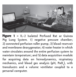 Although these preparations were stable for periods of up to 5 h, they were difficult to perform and control since they used an animal placed in parallel with the perfusion circuit to deoxygenate the blood. Later, the animal was replaced with a membrane oxygenator for the blood deoxygenation.(7) This greatly simplified the system, making it stable and therefore allowing prolonged perfusions, along with assessment of hemodynamic parameters and parameters of respiratory mechanics.(8) The current ex vivo lung perfusion model allows real-time data acquisition and computer-based storage, being marketed under the name IL-2 - Isolated Perfused Rat or Guinea Pig Lung System (Harvard Apparatus, Holliston, MA, USA; Hugo Sachs Elektronik, Hugstetten, Germany; Figure 1). Its wide range of use includes studies of lung preservation for transplantation; studies of respiratory mechanics and gas exchange in models of acute lung injury; functional assessment in models of induced obstructive and vascular disease (i.e., emphysema and pulmonary hypertension); analysis of remote pulmonary effects in metabolic and endocrine diseases (i.e., diabetes); investigation of drug pulmonary metabolism; assessment of absorption and effects of drugs and inhaled agents (by interposing an inventive nebulizer provided by the manufacturer); analysis of gas transport; studies of mechanical ventilation alternatives (i.e., liquid ventilation with perfluorocarbons); etc.