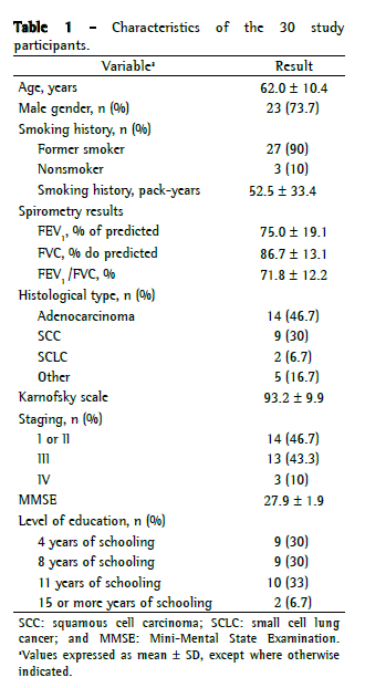 This was a prospective observational study involving 30 patients diagnosed with lung cancer and under treatment at the Oncology/Pulmonology Outpatient Clinic of the Federal University of São Paulo/Paulista School of Medicine, in the city of São Paulo, Brazil. The inclusion criteria were as follows: a definite cytological or histological diagnosis of lung cancer; clinical stability (no changes in the symptoms of cough, expectoration, or dyspnea-these to have been registered on a structured form for outpatient follow-up, together with an affirmation that there had been no hospitalizations or changes in the treatment regimen in the 10 days preceding the interview); and a score equal to or greater than 21 on the Mini-Mental State Examination (MMSE).(8) The study was approved by the local research ethics committee, and all participants gave written informed consent.