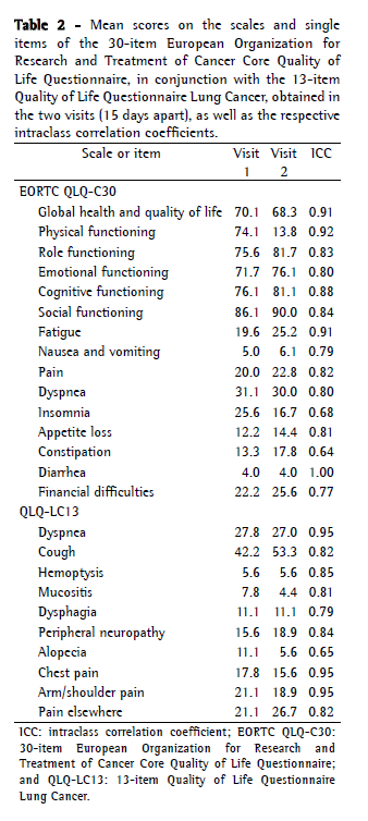 Reproducibility of the Brazilian Portuguese version of the European Organization for Research and Treatment of Cancer Core Quality of Life Questionnaire used in conjunction with its lung cancerspecific module
