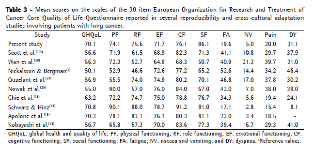In the present study, the mean scores on the global health and quality of life scale and on the social functioning scale of the EORTC QLQ-C30 were above the reference values; regarding the symptom scales, the mean scores on the fatigue scale were below the reference values, whereas, on the pain and nausea/vomiting scales, they were similar to the reference values.(14) The mean scores on all scales of the QLQ-LC13 were similar to the reference values.(14) Table 3 shows the reference values and the mean scores reported for the EORTC QLQ-C30+QLQ-LC13 scales in several reproducibility and cross-cultural adaptation studies involving patients with lung cancer.