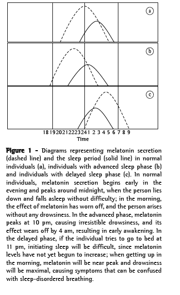 Among the causes of insomnia and drowsiness that are unrelated to respiratory diseases, the most neglected causes might be those related to circadian rhythm sleep disorders (CRSDs). These disorders manifest as misalignment between the sleep period and the physical/social 24-h environmental cycle, related to alterations in internal timing mechanisms. These disorders present two typical patterns, which are principally seen in the adolescent and in the elderly. The complaint that adolescents report can mimic insomnia when they lie down at regular times and it takes them hours to fall asleep. However, it can also mimic drowsiness when they cannot get up in the morning. The elderly can appear to have drowsiness when they fall asleep at 8 pm, while watching television, but they can also seem to have insomnia when they wake up in the middle of the night and cannot go back to sleep (Figure 1). These cases of pseudo-insomnia or drowsiness are actually the most common models of CRSD, with serious consequences to the quality of life of the individual. Therefore, they should always be considered in the differential diagnosis of OSAHS.