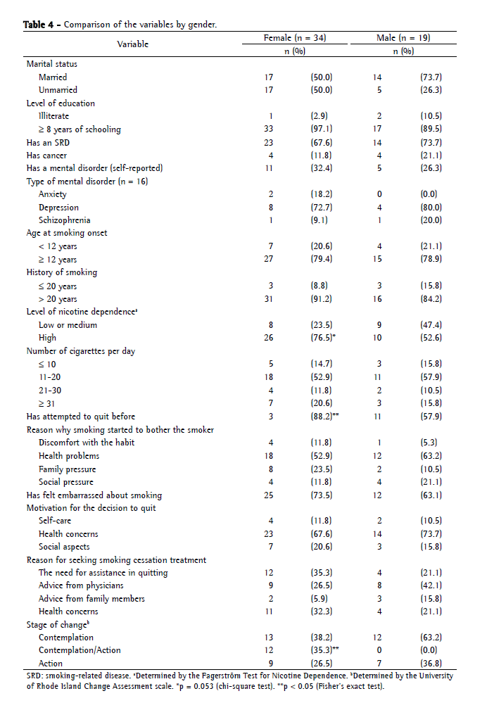 In the comparison between men and women, some differences were found to be significant: distribution by stage of change, men being predominantly in the contemplation stage of change and women having a more balanced distribution of the stages (p = 0.007); previous attempts to quit smoking, the percentage of women who had already attempted to quit smoking being higher than that of men (p = 0.017); and level of nicotine dependence as measured by the Fagerström test, women having a higher level of nicotine dependence than did men (p = 0.053). These data suggest the importance of developing specific strategies for population subgroups, strategies that are more targeted tending to translate to greater effectiveness.(28)
