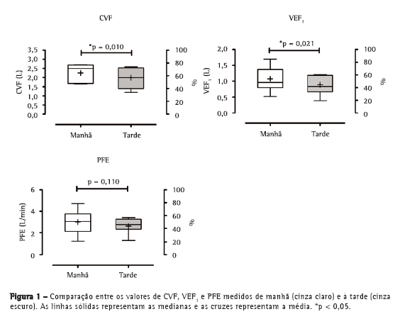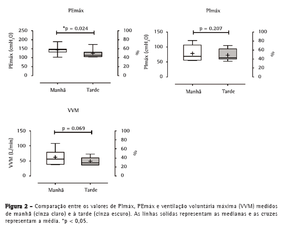 Com relação às variações diurnas nos parâmetros de função pulmonar, observamos que houve queda significativa em CVF e VEF1 (de 13% e 15%, respectivamente) da primeira para a segunda avaliação. Embora tenha havido uma queda de 9% em PFE da primeira para a segunda avaliação, essa diferença não foi significativa. A Tabela 2 e a Figura 1 apresentam, de forma resumida, os principais achados. No presente estudo, os valores de PImáx, PEmáx e VVM (em % do previsto) foram 67,7%, 129,2% e 49,3%, respectivamente. Embora a força muscular inspiratória tenha sido abaixo da normal e isso não tenha ocorrido com a força muscular expiratória, houve uma queda significativa em PEmáx (de 10%) da primeira para a segunda avaliação, bem como quedas não significativas em PImáx e VVM (de 3% e 11%, respectivamente). Esses resultados são apresentados, de forma resumida, na Tabela 2 e na Figura 2.