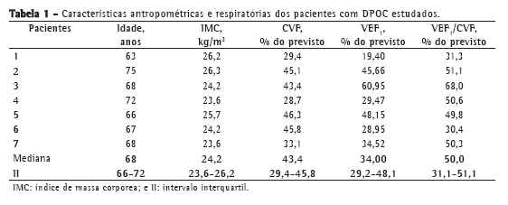 Convidamos 12 pacientes para participar do estudo. Desses, 5 foram excluídos pelos seguintes motivos: não aceitaram participar por falta de interesse (n = 2) ou desistiram de participar após a primeira avaliação (n = 3). Dessa forma, a amostra final foi composta por 7 pacientes do sexo masculino. As características basais dos participantes encontram-se resumidas na Tabela 1. A maioria dos pacientes apresentou obstrução das vias aéreas de grau moderado a grave e índice de massa corpórea normal. De acordo com o sistema de estadiamento da GOLD, a DPOC foi classificada em moderada, grave e muito grave em 1, 3 e 3 pacientes, respectivamente.