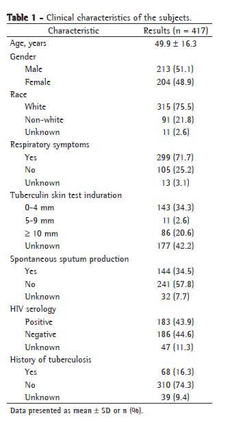 The clinical characteristics of the patients are shown in Table 1. Of the 417 patients studied, 213 (51.1%) were male. The mean age was 49.9 ± 16.3 years. The majority of the patients were White (75.5%) and had respiratory symptoms (71.7%). On the TST, the induration was 0-4 mm in 143 patients (34.3%), 5-9 mm in 11 (2.6%) and ≥ 10 mm in 86 (20.6%). Spontaneous sputum samples were collected from 144 patients with previously negative AFB results (34.5%). In our sample, 183 patients (43.9%) were HIV-positive, and 68 (16.3%) had a history of TB.