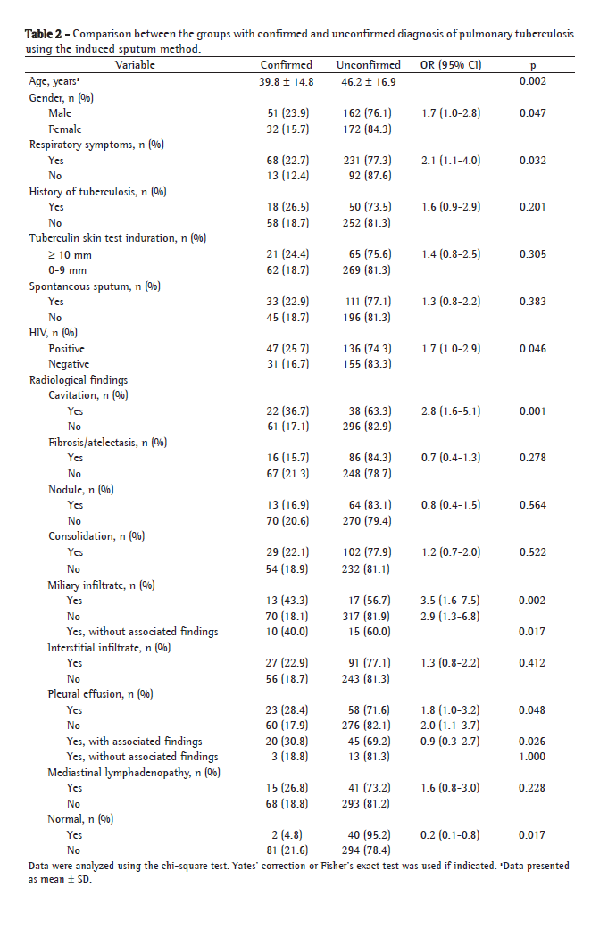 The comparison between the two groups (confirmed and unconfirmed diagnosis of pulmonary TB through IS sample testing) is shown in Table 2. Patients in the confirmed group were significantly younger than were those in the unconfirmed group (p = 0.002). Males predominated significantly in the confirmed group (p = 0.047). Positive IS results were significantly associated with the presence of respiratory symptoms (p = 0.032) and HIV positivity (p = 0.046). In addition, the following radiological findings were significantly associated with the diagnosis of pulmonary TB: cavitation (p = 0.001); miliary infiltrate (p = 0.0002); and pleural effusion (p = 0.048). The rate of confirmed diagnosis of pulmonary TB was significantly higher among the patients with the miliary infiltrate pattern, with or without other radiological findings, than among those without (p = 0,017). However, among those with pleural effusion in isolation, no significant association was found (p = 1.000).
