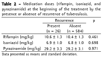 The multivariate analysis revealed that the patients presenting recurrence did not differ from those not presenting recurrence in terms of age (33 ± 12 vs. 36 ± 14 years; p = 0.243), duration of symptoms [90 (15-180) vs. 90 (14-540) days; p = 0.323), gender, race, extent of disease, cavitation on chest X-ray, delayed negative sputum conversion, alcoholism, and DM (Table 1). There was also no difference in terms of the doses of RIF, INH, or PZA (Table 2). The rates of treatment compliance or noncompliance (regular or irregular use of the medication), as well as of HIV-positivity and HIV-negativity, were different between the two groups (Table 1). There were 4 recurrences in the HIV-positive patients and 8 in the HIV-positive patients (30.8 vs. 3.0%) (Table 1). In the HIV-positive patients, recurrence occurred within 15 to 46 months (mean of 27 months) after cure, whereas in the HIV-negative patients, recurrence occurred within 2 to 65 months (mean of 19 months; p = 0.548). The recurrence rate was 5.95/100 patient-years in the HIV-positive patients and 0.48/100 patientyears in the HIV-negative patients.