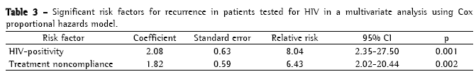 The results are presented as means and standard deviations or as the percentage of patients with a given characteristic. The variable duration of symptoms,withoutnormaldistribution,waslogarithmically transformed prior to the analyses and is expressed as medians (with minimum and maximum values). Data regarding the comparison between the patients who were tested and those who were not tested for HIV, and between treatment compliance and the presence of alcoholism and DM were analyzed using the Student's t-test, the chi-square test, or Fisher's exact test. The potential risk factors for recurrence were analyzed using the Cox proportional hazards model. The relative risks and the (95%) confidence intervals for each variable were estimated by univariate analysis. The variables presenting values of p < 0.20 were included in the multivariate analysis. These analyses were performed considering all 610 patients and were repeated for the 279 patients tested for HIV. The relationship between length of observation and recurrence was analyzed graphically using a cumulative incidence plot. The analyses were carried out using the Statistical Package for the Social Sciences, version 12.0. Values of p < 0.05 were considered significant.