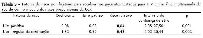 Na análise multivariada com todos os pacientes, sem incluir o resultado do teste anti-HIV, apenas o uso irregular da medicação mostrou-se associado à recidiva da TB. Na análise multivariada com os 279 pacientes testados para HIV, também a presença de infecção pelo HIV mostrou-se independentemente associada à recidiva da TB (Tabela 3). Como os 2 grupos são semelhantes, os resultados obtidos nos pacientes testados podem, eventualmente, ser aplicados a toda a população estudada.