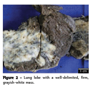 Bronchoscopy with biopsy provided no information that was relevant to the diagnosis. The patient again underwent thoracotomy for surgical excision of the mass. Macroscopic examination of the excised lobe revealed a well-delineated, firm, grayish-white mass, presenting calcified areas and measuring 10.0 × 4.0 × 3.5 cm (Figure 2). Microscopic examination showed that the lung parenchyma presented extensive hyaline fibrosis, areas of calcification, and foci of bone metaplasia (Figure 3). In the periphery of the lesion, moderate lymphoplasmacytic inflammatory infiltrate with formation of lymphoid aggregates, some foreign body granulomas, and foci of bronchiolitis obliterans organizing pneumonia were observed. Screening for birefringent material under polarized light, fungi, AFB, and amyloid yielded negative results. The anatomopathological findings were consistent with hyalinizing granuloma. In the postoperative period, the patient experienced several episodes of bronchospasm, which was reversible with the use of symptomatic medication. At this writing, the patient was receiving maintenance therapy with prednisone (40 mg/day) and had shown clinical improvement.