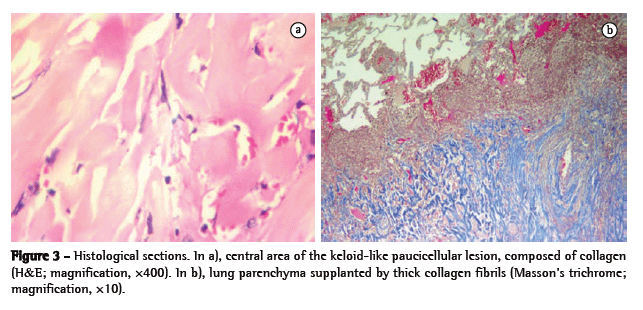 Patients with pulmonary hyalinizing granuloma can be asymptomatic, in which case suspicion of the disease is raised by radiological findings, or can present with dry cough, dyspnea, nonspecific chest pain, fatigue, and hemoptysis.(9) The diagnosis is based on anatomopathological examination, the microscopic aspects of which indicate thick deposits of collagen (keloid-like lesions) arranged concentrically or irregularly distributed, presenting central hyalinization and supplanting the lung parenchyma. At the interface between the lesion and the adjacent parenchyma, there is an increase in cellularity, together with the presence of lymphoplasmacytic inflammatory cells; in addition, there can be formation of lymphoid aggregates and foreign body granulomas.(2,8) There have been reports of extrapulmonary manifestations affecting the kidneys, larynx, and skin.(9,10) In the case reported here, the patient presented with skin involvement, characterized by a subcutaneous nodule. The nodule was investigated through biopsy and diagnosed as osteoma cutis, apparently unrelated to the pulmonary profile. Regarding the therapeutic approach, no specific drug is recommended; however, there have been reports of patients who responded well to corticosteroid therapy at initial doses of 40-60 mg/day.(10)