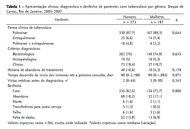 Um estudo transversal com base em um questionário foi realizado em um serviço de atenção primária em Duque de Caxias, uma cidade densamente povoada com uma das menores rendas médias no estado do Rio de Janeiro, com 864 novos casos de tuberculose em 2006, correspondentes a uma taxa de incidência de 101/100.000 habitantes. Dos pacientes que iniciaram o tratamento, 67,2% foram tratados com sucesso, e 16,6% abandonaram o tratamento.(12) Duque de Caxias tem cinco serviços de atenção primária à saúde afiliados ao programa de controle de tuberculose local. Um desses serviços, o Centro Municipal de Saúde de Duque de Caxias, relatou 85% de todos os casos novos de tuberculose e foi, portanto, selecionado como o local para o estudo. Foram considerados aptos pacientes em qualquer estágio de tratamento de tuberculose e foram incluídos aqueles que expressaram seu desejo de participar do estudo assinando o termo de consentimento livre e esclarecido. Um questionário anônimo e de preenchimento voluntário foi proposto aos pacientes com 18 anos ou mais que foram tratados em ambulatório entre 2004 e 2007. Durante esse período, 2.283 pacientes com tuberculose foram tratados, e 560 foram convidados a preencher o questionário em uma das visitas. Todos os pacientes convidados concordaram em participar. Informações sobre idade, gênero, nível educacional, estado civil (mora sozinho ou com um(a) companheiro(a) a despeito do estado civil legal), renda familiar, tempo decorrido do início dos sintomas (tosse, febre, perda de peso e hemoptise) até o diagnóstico, e número de visitas a um profissional de saúde antes do diagnóstico foram obtidas de todos os pacientes Além disso, informações sobre a forma clínica de tuberculose, critérios diagnósticos, história de abandono do tratamento e desfecho foram coletadas das fichas médicas dos pacientes. O número de pacientes vivendo abaixo da linha de pobreza (de acordo com a definição do Banco Mundial, a linha de pobreza é a renda per capita de US$ 1,25/dia) também foi calculado. Os dados foram registrados e analisados com o Statistical Package for the Social Sciences, versão 10 (SPSS Inc., Chicago, IL, EUA). As distribuições das variáveis numéricas foram comparadas entre os gêneros utilizando-se o teste de Mann-Whitney, e as proporções foram comparadas utilizando-se o teste do qui-quadrado. Valores de p ≤ 0,05 foram considerados estatisticamente significativos. O estudo foi aprovado pelo Comitê de Ética em Pesquisa do Hospital Geral da Santa Casa da Misericórdia do Rio de Janeiro.