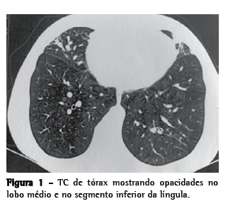 Como persistia a tosse, foi realizada TC de tórax, que evidenciou opacidades em lobo médio, segmento inferior da língula e segmento anterior do lobo superior direito, assim como espessamento das bainhas peribrônquicas, e sinais de impactação mucoide (Figura 1). Em seguida, nova fibrobroncoscopia foi realizada, demonstrando que uma grande quantidade de muco amarelado difuso persistia, e a análise microbiológica revelou o crescimento de Staphylococcus aureus (50.000 UFC/mL).
