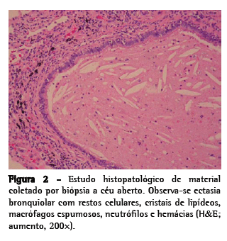 Por haver recorrência do quadro, foi realizada uma biópsia pulmonar a céu aberto, cujo estudo histopatológico revelou um denso infiltrado inflamatório linfoplasmocitário peribronquiolar e granuloma lipídico, levando ao diagnóstico de pneumonia lipoide (Figura 2). O diagnóstico foi confirmado pelo estudo do lavado broncoalveolar, que mostrou macrófagos espumosos circundados por neutrófilos e restos celulares (Figura 3).