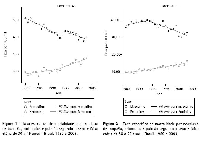 No Brasil, a taxa padronizada de mortalidade por câncer de pulmão, traquéia e brônquios passou de 7,2 por 100 mil habitantes em 1980 para 9,4 óbitos por 100 mil habitantes em 2003. Entretanto, a análise das taxas de mortalidade específicas mostra redução da taxa em homens de 30 a 49 anos e de 50 a 59 anos no período analisado (Figuras 1 e 2). Entre os homens de 60 a 69 anos, ocorreu um aumento das taxas no primeiro período (anos 80 até 1995), seguida de declínio (Figura 3). Entre homens acima de 70 anos e entre mulheres em todas as faixas etárias acima de 30 anos, a tendência é de aumento das taxas em todo o período analisado.