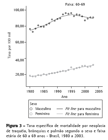Na faixa de 60 a 69 anos, as taxas foram de 76,5/100.000 em homens e 18,4/100.000 em mulheres, com relação de sexo de 4,2/1 (1980). Entre os anos 80 e 1995, ocorreu uma tendência de aumento entre homens, seguida de declínio nos anos seguintes e, em 2003, a taxa de mortalidade foi de 90,9/100.000. Entre mulheres, o aumento foi constante e, em 2003, a taxa foi para 31,9/100.000 (2003), com relação de sexo de 2,8/1 (Figura 3).