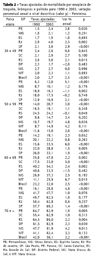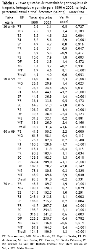 As Tabelas 1 e 2 apresentam as variações percentuais anuais das taxas ajustadas de mortalidade por câncer de pulmão, traquéia e brônquios, segundo sexo e faixa etária, para os estados de Pernambuco, Minas Gerais, Espírito Santo, Rio de Janeiro, São Paulo, Rio Grande doSul,Paraná,SantaCatarina,DistritoFederal, Mato Grosso do Sul e Mato Grosso. Considerando-se que nestes estados, em 2003, a captação de óbitos foi acima de 80% e a proporção de causas mal definidas foi abaixo de 20%, a comparação entre a evolução das taxas no período foi possível.