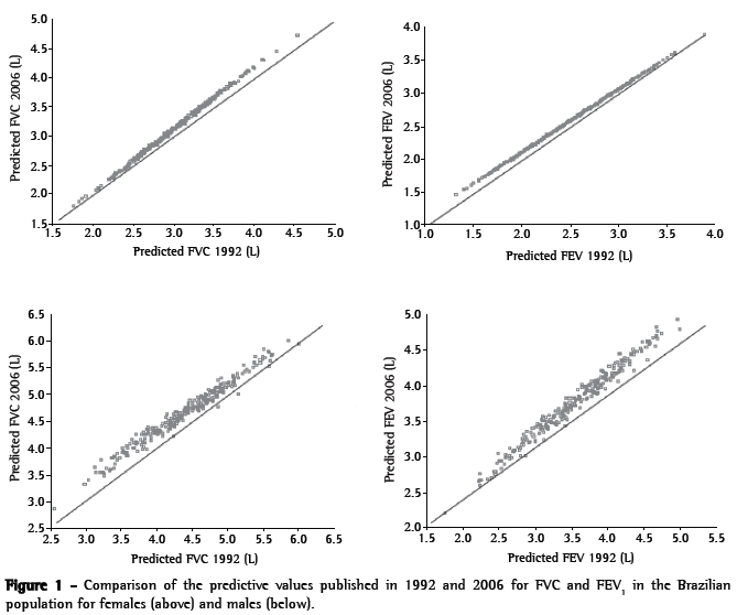Predicted FEV1 and FVC values obtained in the present study were compared to those published in 1992 for the Brazilian population.(4)
