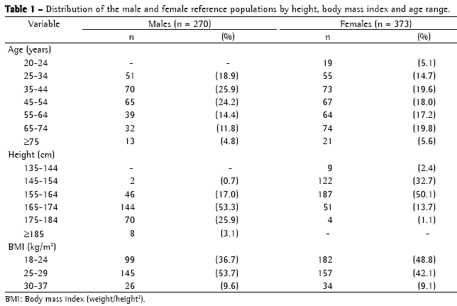 Anthropometric variablesReference values should not be extrapolated for ages and heights other than those included in the regression equations.(7) Individuals of both genders and with height and age greater than those of the individuals studied in 1992 were included in the present study.(4) It is well known that there is a trend toward greater height and greater life expectancy among Brazilians.(14,15)