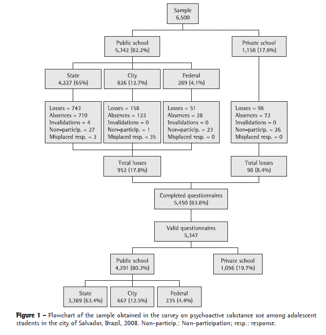 The inclusion criteria consisted of questionnaires being returned in good condition (without tears or erasures affecting readability) and being completed in the classroom by middle or high school (grades 5-11) students between 11 and 19 years of age. Responses in line with the wording of the questions were considered, and, for the analysis of consumption frequency and dependence of a given psychoactive substance, valid responses were those in which the students reported having used that substance at least once in their lifetime, as well as responding to related questions.