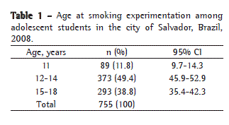 The prevalence of smoking among adolescents in southeastern Europe varies substantially (3.5-42.7%).(4) In the USA, approximately 50% of the adolescent students have already experimented with smoking, the prevalence ranging from 24.9% to 66.3%.(5) Smoking experimentation in the general population of Latin America ranges from 26.9% (in Brazil) to 66.3% (in Chile).(6) In Brazil, smoking experimentation among adolescents ranges from 5.1% to 26.9%.(6-10)
