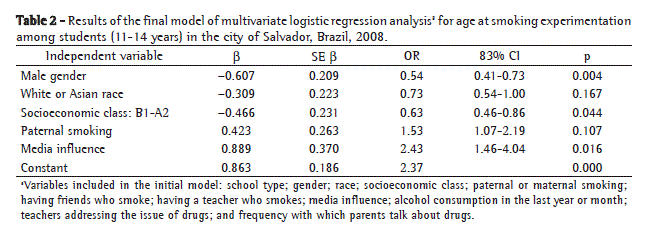 In 2006, during the pilot phase of the study, 12.6% of the students were found to have experimented with cigarettes. Despite the fact that it was a pilot study, the power of the sample size to estimate the prevalence of smoking was higher than 90%.(18) The age at smoking experimentation was found to be 11-14 years, a finding that is in agreement with those of other studies.(9,16,18) Male gender, race (White/Asian), and socioeconomic class (B1-A2) reduced the ORs for smoking initiation. These results are in disagreement with data reported in previous studies, in which a higher prevalence of smoking was observed among White adolescents(5) and male adolescents.(3,5) Belonging to a lower socioeconomic class has been associated with smoking.(1,5)