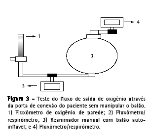Como mostrado na Figura 3, para se medir o fluxo de saída de oxigênio, um fluxômetro de oxigênio de parede e um fluxômetro/respirômetro foram conectados ao balão do reanimador manual e outro fluxômetro/respirômetro foi conectado à porta de conexão do paciente.