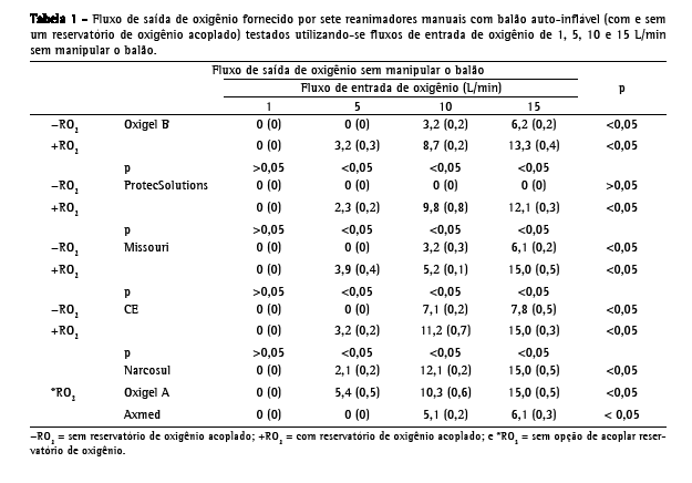 A Tabela 1 mostra as médias do fluxo de oxigênio fornecido pelos sete reanimadores manuais com balão auto-inflável (com e sem um reservatório de oxigênio acoplado) testados utilizando-se fluxos de entrada de oxigênio de 1, 5, 10 e 15 L/min sem manipular o balão.
