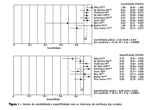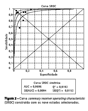 A análise conjunta dos diferentes estudos foi feita por meio da combinação dos valores de sensibilidade e especificidade de cada trabalho, formando uma curva do tipo summary receiver operating characteristic (SROC), que se diferencia da curva ROC pelo fato de cada ponto no gráfico representar um estudo e não os valores individuais avaliados. Cada ponto no gráfico é formado com os valores de VP (ou a sensibilidade) e FP (ou 1 − especificidade) descrito em cada artigo. Para demonstrar a performance do teste diagnóstico como um todo, foi calculada a área abaixo da curva SROC. Para evidenciar a acurácia dos estudos, calculou-se o valor de Q, que representa um ponto que intercepta a curva ROC e uma reta diagonal entre o canto inferior direito e o canto superior esquerdo no gráfico, correspondendo ao maior valor comum de sensibilidade e especificidade. Outro indicador obtido para avaliar a qualidade do teste foi o odds ratio, ou razão de chance, calculado por meio dos valores de sensibilidade e especificidade.(22-24)