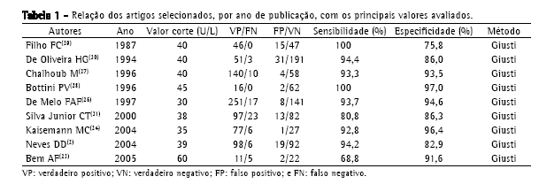 Após a leitura, foram obtidos dados referentes às variáveis importantes de cada estudo, como a identificação do artigo pelo autor e ano do estudo, e as características da metodologia, como população estudada, modo de seleção, técnica de dosagem da ADA, critérios de diagnóstico e a análise estatística utilizadas. Estes dados, assim como o valor discriminatório utilizado e os valores da sensibilidade e especificidade, com seus respectivos intervalos de confiança, foram adicionados a uma tabela quando disponíveis. Em separado foi construída outra tabela para os valores observados de VP, VN, FP e FN em cada estudo. Quando os resultados expressos pelos autores não permitiram uma extração direta dos valores citados (VP, VN, FP, FN) esses foram calculados com base nos dados fornecidos no texto.(22-24)