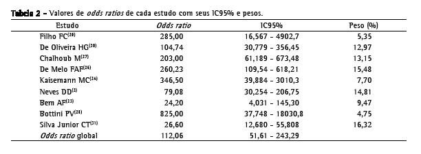 A Figura 2 mostra o resultado da curva SROC construída com os nove estudos. São demonstradas três curvas, sendo a central correspondente à verdadeira curva SROC e as periféricas a seu IC95%. A área abaixo da curva foi calculada em 0,9696 e o maior valor comum de sensibilidade e especificidade, chamado de valor de Q, foi de 91,9%. O odds ratio foi calculada para cada estudo com seus respectivos IC95% e peso, podendo ser vista em detalhes na Tabela 2. O odds ratio global foi de 112,0 (IC95%: 51,6-243,2).