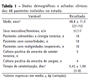 Os dados demográficos e clínicos são mostrados na Tabela 1. Dos 48 pacientes, 17 eram do sexo feminino e 31, do masculino. A média de idade dos pacientes foi de 48,8 ± 11,5 anos (variação, 27-73 anos). Dos 48 pacientes, 18 (37,5%) haviam sido submetidos a cirurgia torácica: excisão do tumor, em 14; redução do volume pulmonar, em 2; ou esofagectomia, em 2. As amostras de CT coletadas de 3 dos pacientes mostraram crescimento bacteriano (cultura positiva), assim como as amostras de sangue coletadas de outros 2 pacientes. Culturas positivas foram obtidas em ambos os tipos de amostras (CT e sangue) em outros 2 pacientes. Um desses 2 pacientes mostrou sinais clínicos de infecção (proliferação de Klebsiella pneumoniae), e a infecção foi controlada com antibioticoterapia adequada. Não foram observadas complicações clínicas, reações pleurais ou aumentos na drenagem nos outros 47 pacientes.