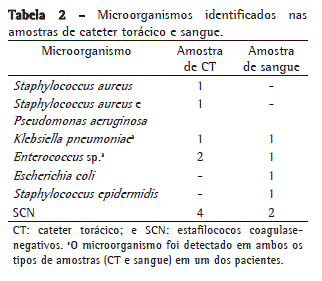 A Tabela 2 mostra os microorganismos identificados nas amostras de CT e sangue.